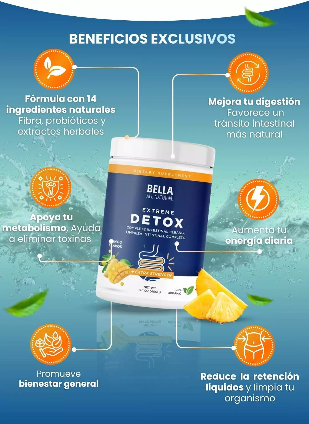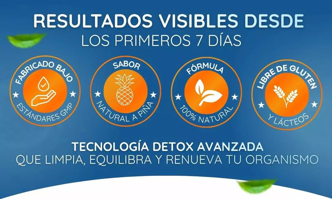 Apoya la pérdida de medidas de forma natural al eliminar toxinas, mejorar la digestión y reducir la retención de líquidos. No es un quemador de grasa, pero sí favorece un cuerpo más ligero.