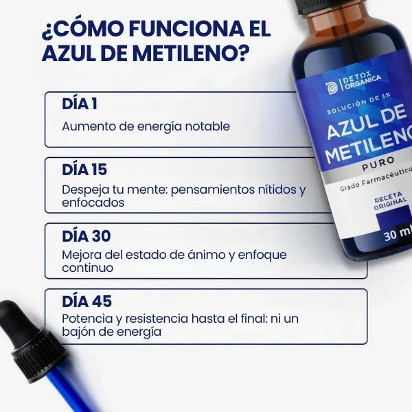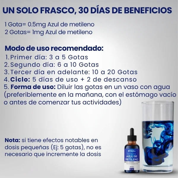 NeuroBlue está elaborado con estándares de pureza y calidad aptos para consumo humano. Además, estudios científicos avalan el uso del azul de metileno en medicina y neurociencia desde hace décadas.